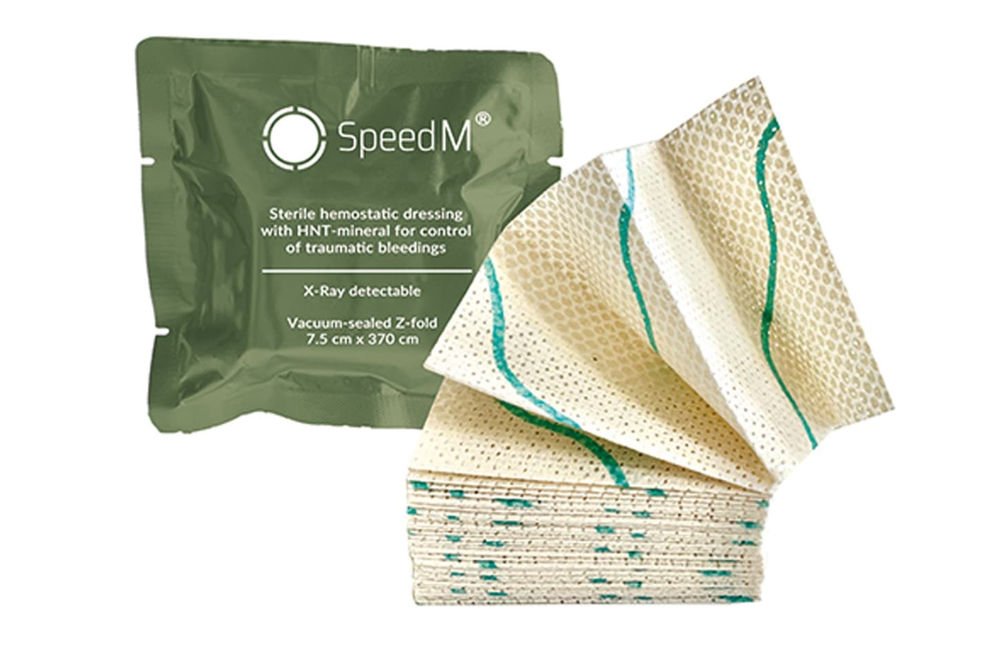 SpeedM® ist eine Notfall-Blutstillungskompresse, die zur vorübergehenden Behandlung stark blutender traumatischer Verletzungen bestimmt ist. SpeedM® Notfall-Blutstillungskompresse ist ein steriler, 7,5 x 370 cm großer, röntgen-detektierbarer, Z-förmig gefalteter hämostatischer Verband und ist für aseptische Entnahme verpackt.