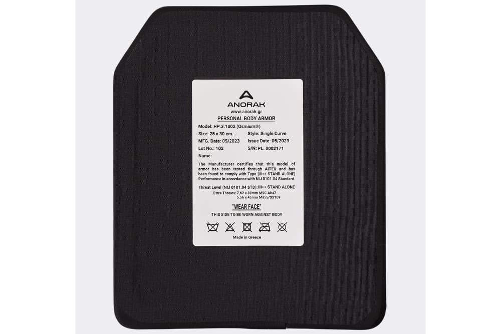 OSMIUM® – HP.3.1002” Stand-Alone Hard Armor Plate Provides protection from multiple shots (at least 6 shots) of calibers 7.62x51mm M80 NATO BALL, 7.62x39mm Mild Steel Core AK47 KALASHNIKOV and 5.56x45mm M855/SS109, Stand-Alone, with the minimal weight of 1.740 grams.. “OSMIUM® – HP.3.1002” Stand-Alone Hard Armor Plate has been certified by an authorized laboratory to this effect.