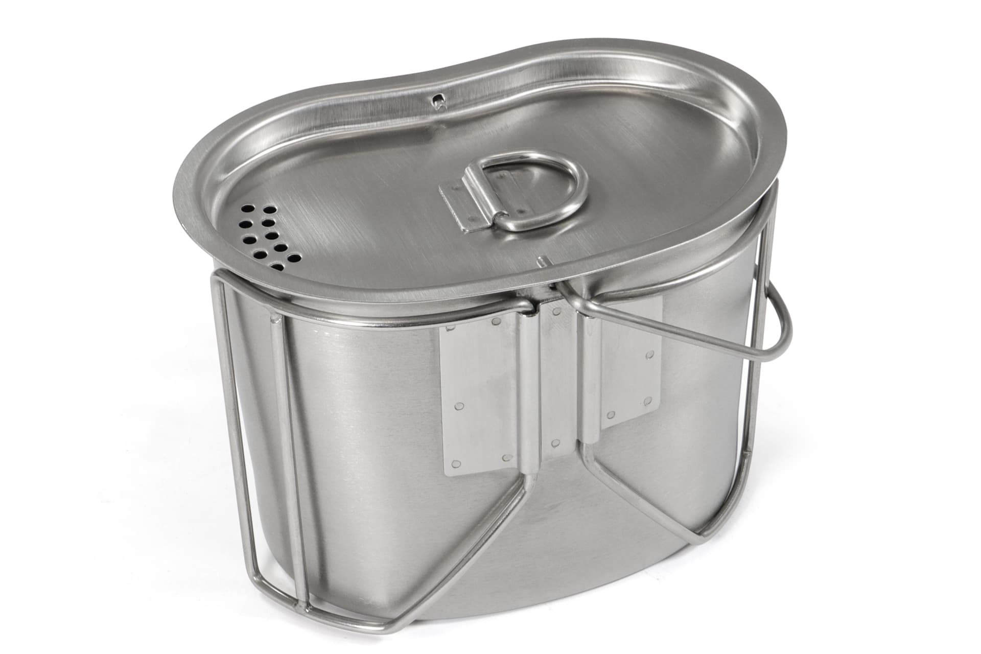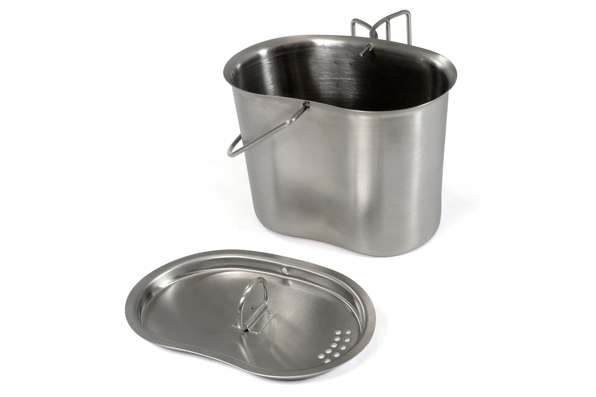 The canteen mug is made of robust stainless steel. It offers optimum functionality both as a pot and as a mug thanks to its classic kidney shape. The handles can be quickly folded out if required and provide a secure hold when drinking or cooking. The hanging bracket also offers the option of attaching the mug above the fire. Due to the lid, the heat can be used more efficiently and the heating of drinks or food is much faster. The practical folding handles and hanging bracket make it suitable for a variety of uses and perfect for an outdoor adventure.